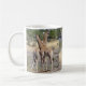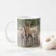 Kaffet mugg innehåller två separata bilder av baby-giraffer. Dessa unga giraffer var ensamma när vi såg dem. Hoppas att vuxnorna var i närheten. Dessa foton togs nära Chitabe Camp i Botswana i juli 2018.