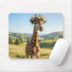 A charming giraffe wearing a crown of colorful flowers stands in a sunlit field, with serene rolling hills in the background