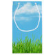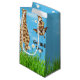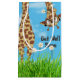 Cute giraffe med glasögon och vit daisy i munnen i grönt gräs och himlar för att komma snart. Text kan redigeras.