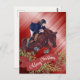 Den här hälsning-vykortet för julen i helgdag har en flicka som rider en brun häst och hoppar på en God jul-banderoll med röd bakgrund. -