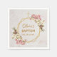 Den här elegant blommigtens baptism pappra napkin som rekommenderas för en flickas baptism har en geometrisk oregelbunden guld ram med blomsterbuketter av vita och rosa orkidéer upp höger och ner lämnat över två guld hexagoner som täcker över, med en guld högst upp i kor. Barnets namn är skrivet i ett kalligrafiskt skript för elegant. Resten är skrivna i mindre versaler. All text har en gyllene gult färg, som guld ram. Vintagens blombukett med rosa och vita orkidéer kommer från ett vykort för vintage av Bertha Maguire (1862-1910), som nu är offentligt.