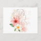 This is a digital watercolor-style illustration featuring a serene, feminine profile of a woman with closed eyes, evoking a sense of calm and introspection. The woman's face is delicately outlined in black, with minimalistic, flowing lines that capture the gentle curves of her face and wavy hair. Her hair, also outlined in black, cascades down her neck and shoulders, blending seamlessly with the surrounding floral elements. A large, pink hibiscus flower is positioned on her left side, its petals and green leaves adding a touch of vibrancy and life to the composition. In the background, there are soft, watercolor washes of pink and green, with subtle, overlapping floral patterns that enhance the dreamy, ethereal quality of the illustration. A larger, white flower with a yellow center is prominently displayed at the bottom of the image, adding contrast and depth. The overall color palette is soft and pastel, with gentle pinks, greens, and whites dominating the scene. The texture of the watercolor medium is evident, with delicate, translucent washes and subtle gradients that give the illustration a light, airy feel. The background is mostly white, allowing the floral elements and the woman's profile to stand out.