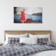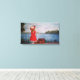 Little girl in red standing beside a lake, with a nostalgic look to the horizon, her suitcases next to her.
