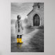 Girl on a path facing a stone building in grayscale, with bright yellow boots as the only color accent. Misty trees and quiet rural setting. Watercolor-style AI artwork.