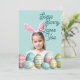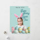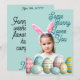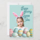 Girl Photo with funny Easter Bunny Ears and painted eggs on blue background. Generative content images may be changed. Humor Greeting saying "Some Bunny Loves You" on the front of the card, and on the back, the greeting text. If you replace the girl photo with your own, please use the option "remove background" from edit menu.