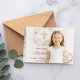 Add a horizontal size photo. A pink and ivory colored floarl wreath and a golden cross as decoration in the right corner. Personalize and add a name and thank you note.
