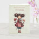 Birthday card with a cute retro image featuring a whimsical girl with rosy cheeks and flowers in her hair. Carrying a green frog doll.