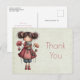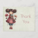 Thank you postcard with a cute retro image featuring a whimsical girl with rosy cheeks and flowers in her hair. Carrying a green frog doll.
