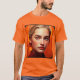A girl with blue eyes on an orange background, dark black and crimson, photorealistic fantasies, personal iconography, detailed character design, shiny/glossy