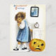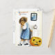 Vintage Halloween-illustration som visar en tjej och Jack av Lantern med texten " Spooks and witches är upptagna till natten och ängsliga för att skrämma bra barn. "låt oss dig att avfärda charmen, skratta, vara glad och glömma allt alarm."