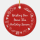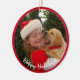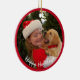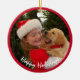 Vad kan vara mer spännande än en ny valp vid jul! Söt ung flicka i Santa som håller sin nya valp. Puppy bär en röd krage. Julgran finns i bakgrunden. En roligt eller dekoration till träd. Starka julprydnader för ditt hem eller för gåvor. Ändra enkelt texten till din egen. Ändra även fotot till ett eget om du vill.