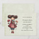 A birthday invitation with a cute retro image featuring a whimsical girl with rosy cheeks and flowers in her hair. Carrying a green frog doll.