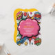 A vibrant pop art style invitation design featuring a large pink speech bubble prominently placed in the center against a white background. The speech bubble has a glossy, cartoon-like appearance with a bold black outline and small circular highlights, ready to contain party details or messages. Surrounding the central bubble, colorful pop art elements burst with energy including comic book-style "POW!" and "BOOM!" text effects, rainbow starbursts, polka dot patterns, and lightning bolt shapes in bright primary colors of red, blue, yellow, and green. The overall design captures the playful, high-energy aesthetic of 1960s pop art with bold outlines, Ben-Day dot patterns, and a cheerful color palette perfect for a children's celebration.
