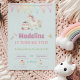 This cute girly unicorn birthday card features a pretty birthday cake and a pretty rainbow unicorn on o turquoise background. The name and age can be changed. The back has a matching pattern with unicorns and candy. Add your RSVP info.