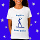 En knut på "strålens drottning" gymnastik som säger att Beam Queen gymnast t-shirt med namn på framsidan och säger gymnastik på baksidan.