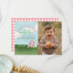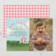 Send a sweet thank you after your girls barnyard bash! This adorable farm-themed thank you card features a watercolor pink barn, baby pig, cow, sheep, and chick, with space to add your favorite photo from the party. The front includes the playful phrase: “Oink, Baa, Moo – a big thank you!” and the back showcases a classic pink gingham pattern. A perfect way to thank guests after your toddler’s 2nd birthday celebration!