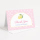 En feminin och elegant tacksamhetskortdesign med ett vintage-tryck i kakel nyanserat i rosa och en ensam akvarellcitron. En flexibel design som kan användas för ett tacksamhetskort för baby shower eller bröllops shower eller som ett personligt anteckningskort.