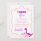 Ett tema för söt, roligt och gigantisk dinosaurie Tack vare ett kort för lila glittery Brontosaurus dinosauer och en rosa Triceratops med lila glittery horns som alla sätts på en rosa och vit stripeybakgrund med söt blek rosa ram. Ett underbart sätt att tacka dem som närvarade vid ditt barns födelsedagsfest och för deras gåvor. Anpassa genom att lägga till ditt barns namn och meddelande .Det aktuella meddelandet lyder " för att du skulle få smitta i party, det var DINO-MITE som hade dig där och tack för min gåva". Ett underbart spel på ord och en roligt söt design.