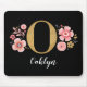 Ett vackert, feminin monogrammat musknapp av rosa blommigt, med rosa blommor och ett faux guld monogram brev O på svart bakgrund. Anpassa musknappen genom att lägga till ditt namn under monogrammet. Gör en roligt till en vän eller till en brud gåva. Designad av Blackberry Boulevard.