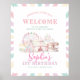 Det här välkomsttecknet för pastel färg-födelsedag innehåller ett vismiskt karneval-tema, perfekt för att fira vilken barn som helst. Det står "KOM ONE, KOM ALL! VÄLKOMMEN TILL DEN UNDERBARARE FÖDELSEDAGSFESTEN PÅ JORDEN!" i ett lekfullt cirkus-stil-typsnitt högst upp, med klara illustrationer av ett ferrihjul, cirkushjul, tält, ballonger och karusellfärgade i mjuka pastellhuvar. I mittpunkten markeras barnets namn i ett elegant-skript följt av anpassadet "1ST BIRTHDAY" i fet brev, tillsammans med datum och plats för anpassadet i grund. Gräns med pastel rand förbättrar formgivningens festila och trevliga atmosfär.