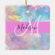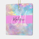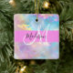 Girligt regnbåge, holografisk iridescent monogram namn och initialt keramiskt prydnadsämne. Ditt eget namn och monogram är skrivna i ett skript med elegant och rosa bakgrund. En perfekt födelsedag eller julklapp!