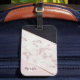 Elegant Girly Ro Marble Abstrakt Monogram-design är perfekten till behålla av påsarna medan du reser. Den här formgivningen har svart, rosa och marmor rand från ro guld åtskilt av tunt guld rand. Anpassa med namn, monogram, inledande text eller text. Du kan ändra färg och teckensnittet stil genom att anpassa det ytterligare. Faux glitter med gnistra.