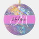 Girly rosa, persiko- och aqua holograf iridescent monogram namn och initial keramisk ornament. Ditt eget namn och monogram är skrivna i ett skript med elegant och rosa bakgrund. En perfekt födelsedag eller julklapp!