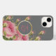 Elegantens telefonfodral med en grått-bakgrund, försedd med ett vackert motiv för blommigten. Fintvätt av rosa ros med grönt löv skapar en charmerande design som exuderar nåd och feminitet. I mitten kan du med en gyllene gult anpassa fodral med initialer