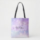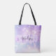 Skorg och söt väska med en färgstark rosa, lila, lilak och blått enmajsliknande regnbåge med gnidig bakgrund. Ditt eget namn och monogram är skrivna i ett handskript med elegant med en lilac lila Unicorn-målpensel--bakgrund för rand. En perfekt födelsedag eller julklapp!