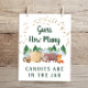 Tekspelsskylt för din babydusch med "Gissa hur många kaner som finns i Burk" skriven i rustisk typografi och ett skript för skogsbruk och en vattenfärgad illustration av skogsdjur med tält-camping i bergen och skogen under en himlar av guld-stjärnor. Ställe i burk eller flaska fyllda med matsalar under varandra och be dina gäster gissa hur många som finns i burk. Vinnaren blir gästen som kommer närmast utan att gå över. Matchande gissningskort finns i vår Äventyr Awaits Woodland Animals Baby Shower Collection.