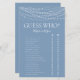 Det här underbara dammiga blåa LGBTQ Gissa vem?-bröllopsdusch-spelbladet är enkelt och charmerande - perfekt för vilken dusch som helst som firar 2 brudar. Det här roliga och enkla spelet kommer säkert att ge massor av skratt till vilken bröllopsdusch som helst! Ge helt enkelt ett blad till varje gäst (glöm inte pennorna) och låt roligheten börja! Du kommer att bli förvånad över hur många saker folk vet om brudarna. Om sekunder kan du se hur ditt spelblad kommer att se ut. Välj helt enkelt Anpassa denna mall och skriv in namnen på brudarna.