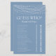 Den här vackra dammiga blå ljus Gissa Vem? möhippa-matchen lakan är enkel och charmig - perfekt för varje dusch. Den här roligten och det enkla spelet kommer säkert att föra med sig mycket skratt till vilken möhippa som helst! Bara ge per lakan till varje gäst (glöm inte pennorna) och låt roligten börja! Du blir förvånad över hur många sak människor som känner till bruden och brudgummen. Om några sekunder kan du se hur ditt spel lakan kommer att se ut. Välj Anpassa den här mallen och skriv in den i namn och i namn på brudgummen.