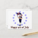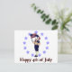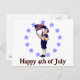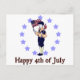 Glad 4:e juli Vintage Art i antika koloniala bokstäver och en pojke som håller röda högtidsfyrverkerier och en amerikansk flagga, omgiven av 13 blå stjärnor.