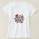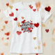 En vit T-tröja med en levande grafik. Utformningen visar frasen "Glad Alla hjärtans dag!" i fet, lekfull skrift, omgiven av spridda röda hjärtan. Det övergripande utseendet är glädjande och festligt, perfekt för henne!