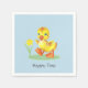 Glad ankunge med blomma på ljusblå servetter. Text redo att anpassas.