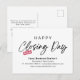 Glad stängningsdag Realtor minimalistiskt personligt vykort. Professionellt fastighets-vykort som gåva till köpare eller säljare. Fira din klients stora dag med detta professionella och minimalistiska vykortet "Glad stängningsdag", designat speciellt för fastighetsmäklare och fastighetsbolag. Med sin rena och moderna stil lägger detta vykort en personlig touch till din kundlek och håller ditt varumärke polerat och professionellt. Det är särskilt populärt bland fastighetsbolag som föredrar en snygg, modern stil. Detta vykort erbjuder anpassning både på framsidan och baksidan, vilket ger dig gott om utrymme att anpassa ditt meddelande, lägga till ditt namn, kontaktuppgifter eller/och inkludera din företagslogotyp. Medan det är designat med köparkunder i åtanke, gör den redigerbara texten det enkelt att anpassa för säljar-kunder också. Denna enkla och omtänksamma gest hjälper dig att sticka ut,