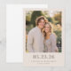 Denna bröllops-"save-the-date"-kort har ett varmt, intimt fotografi av två individer som står tätt tillsammans i en mjukt suddig trädgårdsmiljö. Färgpaletten inkluderar mjuka jordtoner som beige och dämpade gröna nyanser, vilket skapar en lugn och inbjudande atmosfär. Den rena, centrerade layouten framhäver datum och namn med modern sans-serif-typografi, vilket säkerställer klarhet och fokus på viktiga detaljer. Det övergripande humöret är glatt och romantiskt och fångar ett äkta ögonblick av glädje och samhörighet, perfekt för att dela med sig av din kommande firande.