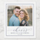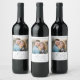 Denna etikett för bröllopsvin har en modern och elegant design med en stor, inramad bild som upptar den övre delen. Färgpaletten inkluderar naturliga toner från fotot, kompletterat med ett monokromt textfält i svart skrivstil och tryckstil på vit bakgrund. Typografin framhäver ordet "skål" i en elegant kursiv stil, följt av namn och datum i ren, versal stil. Stämningen är glad och intim, perfekt för att fira speciella tillfällen som bröllop eller årsdagar.