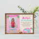 Denna bedårande Glad Campare Tjej Foto Födelsedagsfest Inbjudan inbjudan har ett rosa, turkos, orange och grönt färgschema och bedårande campinggrafik som en söt rosa vintagecamper, ballonger, träd, trädgård bakgrund, en lägereld och rostning marshmallows över elden. Denna inbjudan är perfekt för ett barns camping-, s'mores- eller utomhus-tema födelsedagsfest!