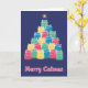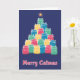 Ett färggrant julkort med katter i form av en julgran. Blå bakgrund. Texten längst ned på kortet säger "Glad Catjul". Tom insida för ditt eget meddelande. Storlek 13 cm x 18 cm.