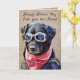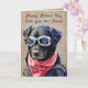 En svart Labrador-valp, iförd sportiga skyddsbrillor och en röd halsduk, önskar glad fadersdag till världens bästa pappa. Detta roliga kort har tassavtryck på insidan och ett hjärta på baksidan. Hälsningen lyder: Jag är ganska säker på att du är den bästa pappan en hund kan ha. Din belöning blir Massor av blöta kyssar! Denna stilig puppa kommer säkert att få hundpappan i ditt liv att le.