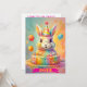 En lekfull liten kanin sitter stolt med en livfull födelsedagstårta. Kaninen är omgiven av mjuka pastellfärger, fantasifulla dekorationer och ballonger som skapar en glad och festlig stämning perfekt för en speciell dag.