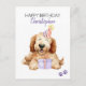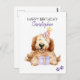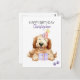 Grattis på födelsedagen med personligt namn. En söt Labradoodle-valp med födelsedags hatt och ballonger. Lägg till eget meddelande för ett unikt kort. Akvarellkonst.