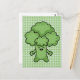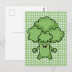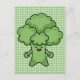 Söt grön tecknad broccoli med en bedårande glad ansikte. Bakgrunden är ett grönt och vitt gingham-mönster.