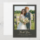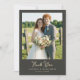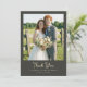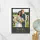 Det här bröllop tack-kortet har ett charmigt fotografi av ett par som står framför ett rustikt trästaket, omgivet av frodig grönska och en öppen himmel. Designen använder en mjuk färgpalett med naturliga gröna, blå och jordnära bruna nyanser som skapar en varm och inbjudande atmosfär. Elegant typsnitt i skrivstil framhäver frasen "Tack" medan anpassningsbara platshållare möjliggör personlig anpassning med namn och platsinformation. Den övergripande stilen är naturlig och glad, fångar äkta känslor och gör den perfekt för att uttrycka hjärtlig tacksamhet efter en speciell fest.