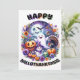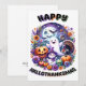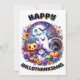 Halloween 5x7 Välkomstkort med "GLAD HALLOTACKMAS" med en färgrik grafik med en söt halloween-scen med en spöke, jack-o-lantern, fladdermöss och måne med en kalkon och snöman som bär en häxa hatt omgiven av färgglada blommor i lila, orange och gröna färger. Skicka detta söta kort till nära och kära, vänner, människor du hjälper som är ett bra sätt att säga "Hej" och inkludera din speciella anteckning.
