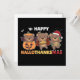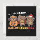 Glad Hallothanksmas - glad Halloween, Thanksgiving och jul. Björnen är utklädd till fladdermus på Halloween. Med paj på Thanksgiving. dekorerad med tomtens mössa på jul.