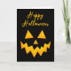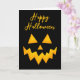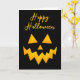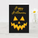Ett gratulationskort med en lysande Jack o Lantern pumpa ansiktsdesign på svart med orden Glad Halloween på framsidan. Insidan lyder “Må alla dina spöklika önskningar gå i uppfyllelse.”