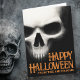 Halloween-kort med en vit, kuslig skalle på svart bakgrund med ditt anpassade namn och orange text “Glad Halloween” i ett utsirat, rått typsnitt.