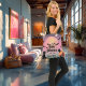 En charmig halloweenillustration med en mjuk rosa-lila måne, flygande fladdermöss, svarta katter, lysande pumpor och kusliga silhuetter.